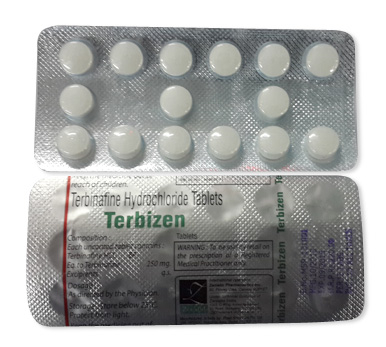 - Terbinafin je určen k léčbě mykóz nehtů a kožních plísňových infekcí. Droga působí jako inhibitor squalen epoxidázy, což brání vzniku sterolů v plísních.